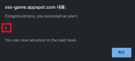 자 그러면 이렇게 축하한다는 메시지와 함께 저희가 공격구문에 넣은 '1'이라는 문자도 같이 팝업으로 나타나며 문제가 풀리게 됩니다.