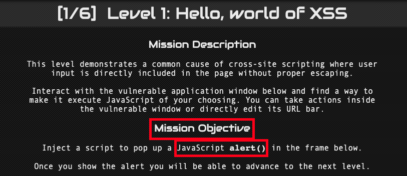 Misson Objective, 즉 이번 문제의 목표를 보시면, "Javascrpt alert()함수를 실행시켜라"라고 되어있습니다.