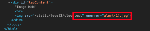 코드에서는 큰 따옴표를 썼으니 test하고 큰 따옴표 입력해준 뒤 이어서 onerror 속성을 넣고 다시 큰 따옴표를 열어 alert 구문을 작성해주고 마무리 합니다. (뒤에 남은 큰따옴표가 있으니까 따옴표를 닫아주지 않아도 됩니다!)