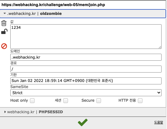 먼저 쿠키 조건부터 맞춰주기 위해 edit this cookie로 oldzombie라는 쿠키를 생성해 주었다.