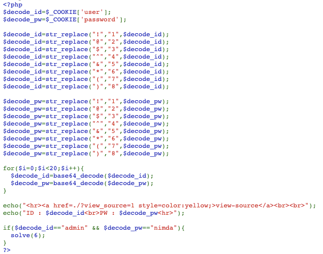간단히 정리하면 문자열 치환과정과, 20번의 base64 디코딩을 통해 admin, nimda가 되는 값을 찾아내라는 문제이다.