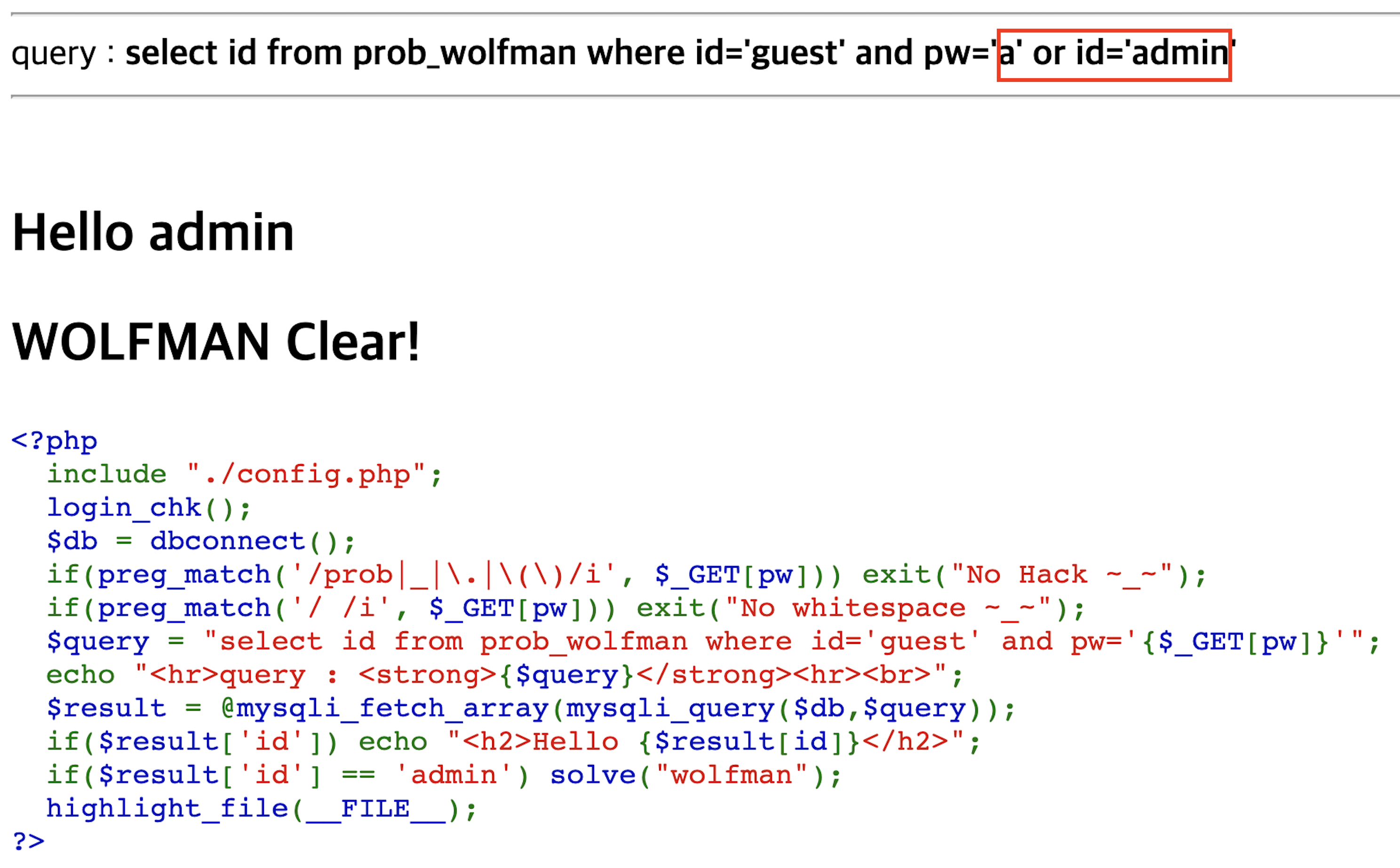 위 3가지 특징을 한 줄로 정리하면 'id가 guest로 고정된 상태에서 pw 파라미터를 이용해 띄어쓰기를 쓰지않고 공격하여, 조회된 id가 admin이 되도록 만들어라' 이다.