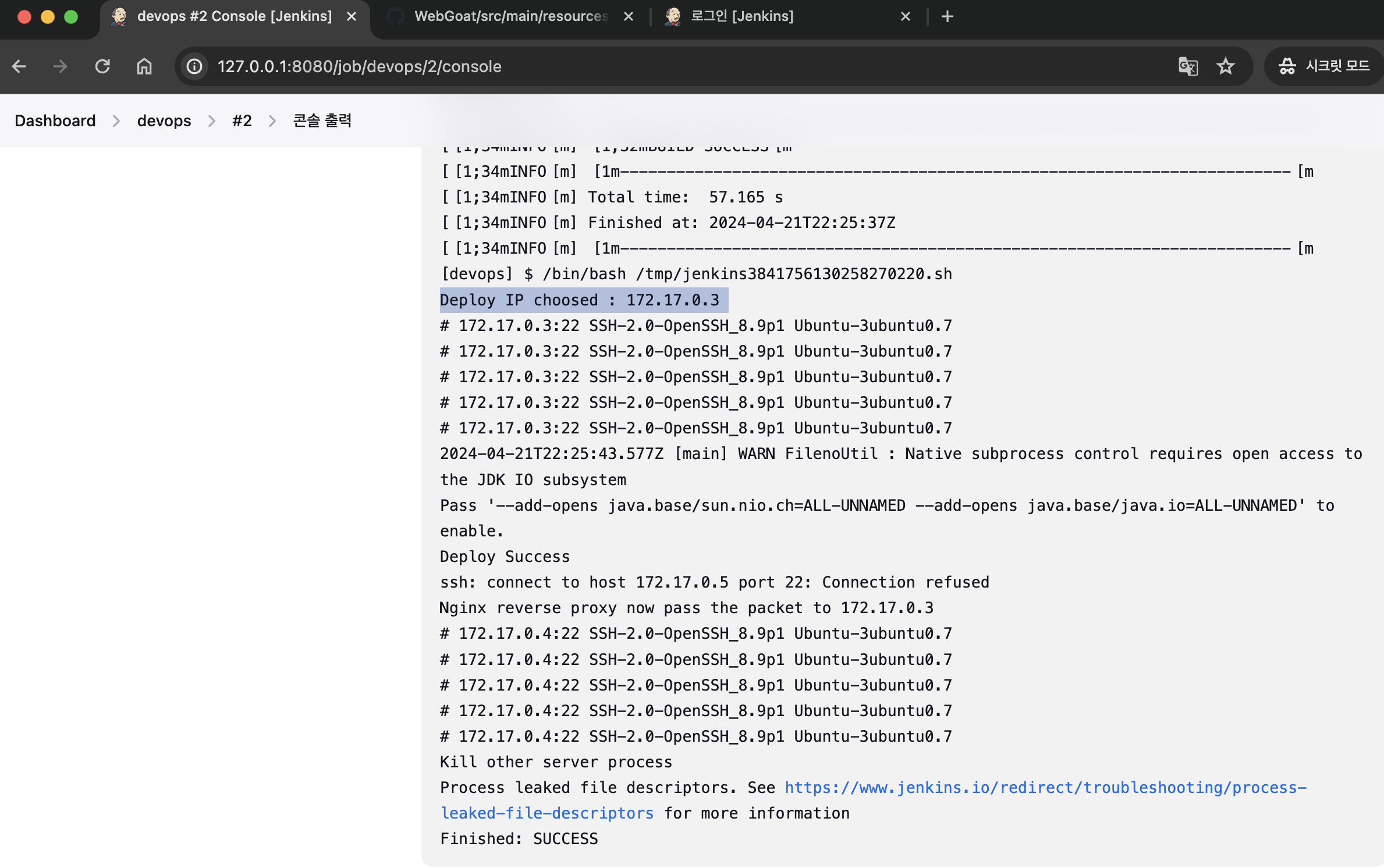 이번 빌드를 통해 172.17.0.3 IP를 지닌 서버에 배포가 이루어졌다.