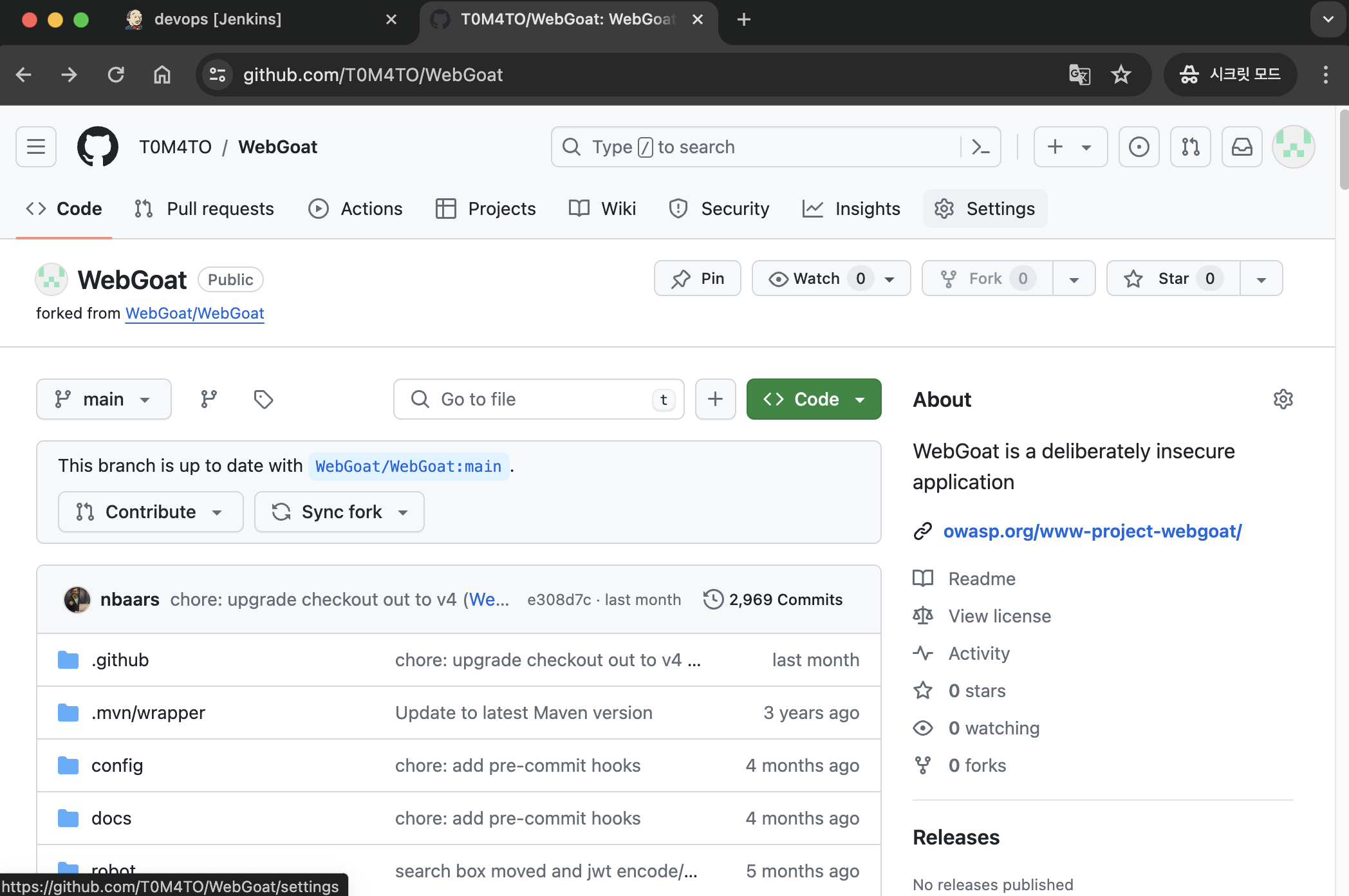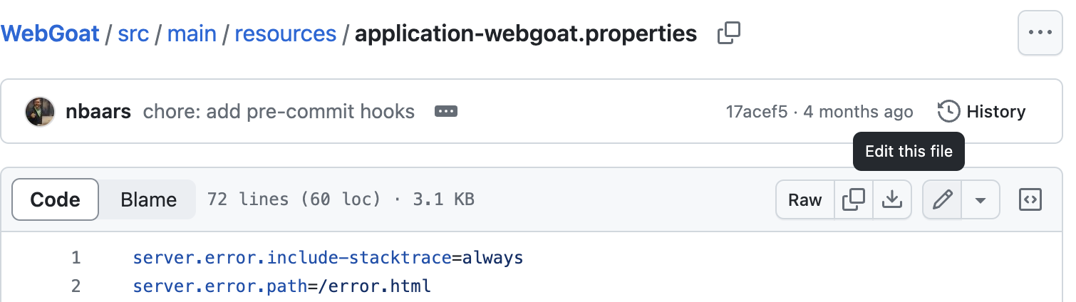 해당 Repository develop브랜치 에서 src -> main -> resources -> application-webgoat.properties 파일을 찾아 클릭한다.