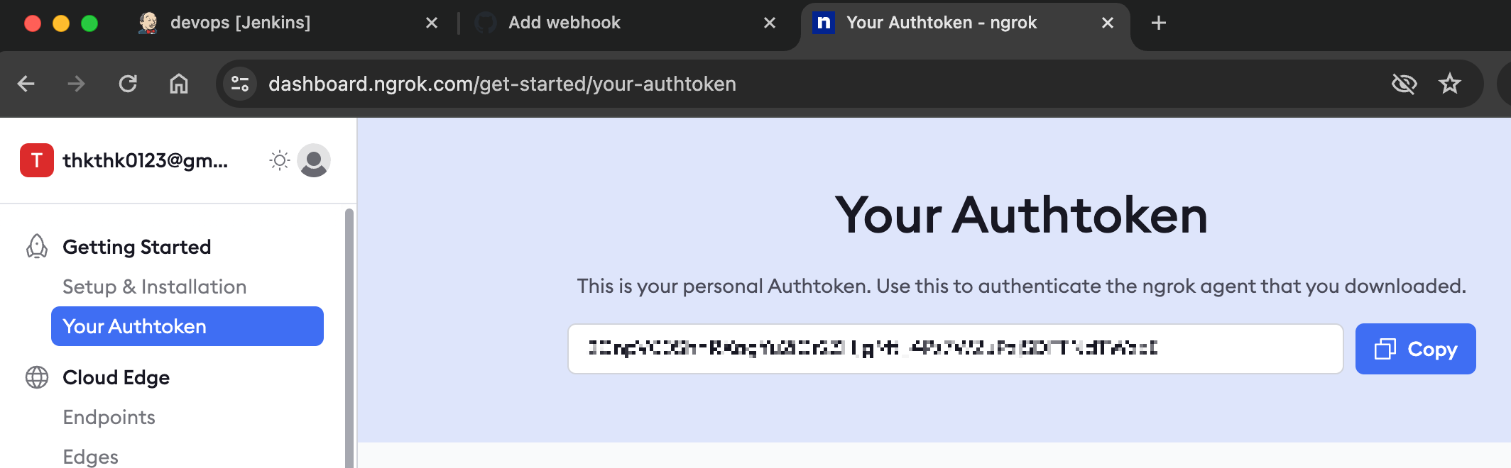여기서 왼쪽에 있는 Your Authtoken 메뉴로 이동하면 ngrok 사용을 위한 토큰 값을 확인할 수 있다. 이 값을 복사해두도록 하자.