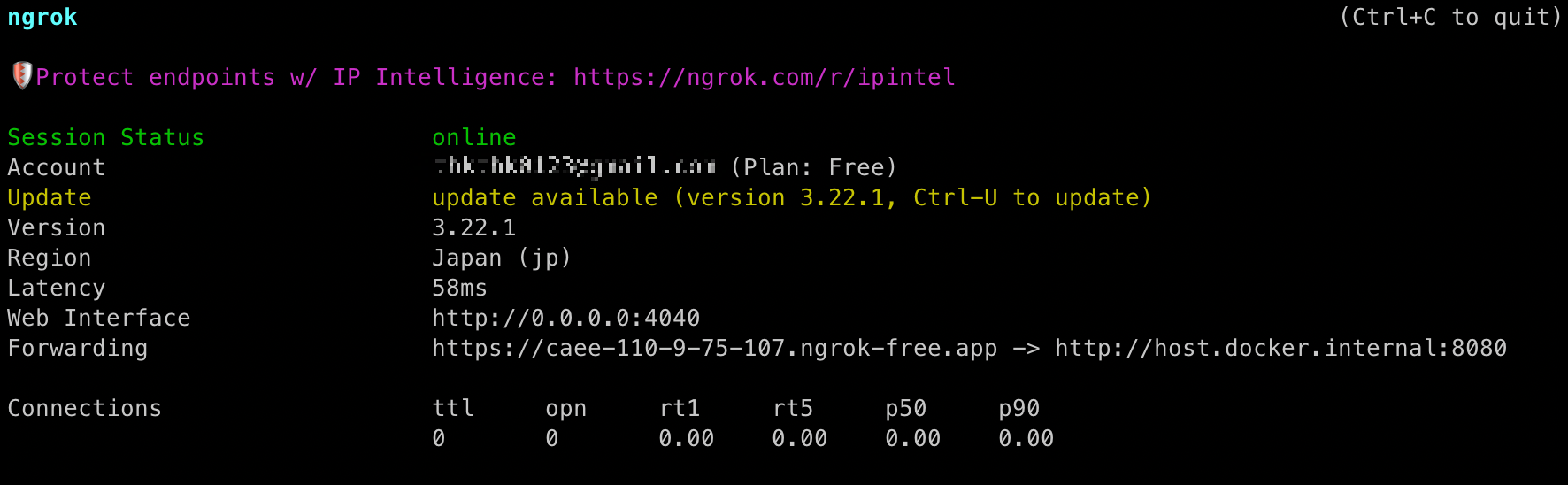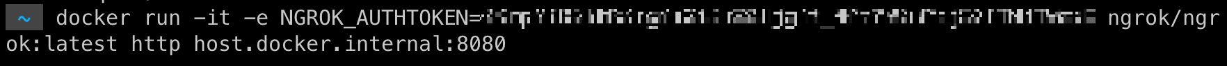 그리고 또 하나의 터미널을 열어 'docker run -it -e NGROK_AUTHTOKEN=[복사한 토큰 값] ngrok/ngrok:latest http host.docker.internal:8080' 명령어를 통해 ngrok을 Docker 컨테이너를 이용하여 실행시켜, ngrok이 제공하는 도메인을 통해 접속 시 host.docker.internal(실제 host를 의마)의 8080번을 외부에서도 접근가능하도록 노출 시킬 수 있다.