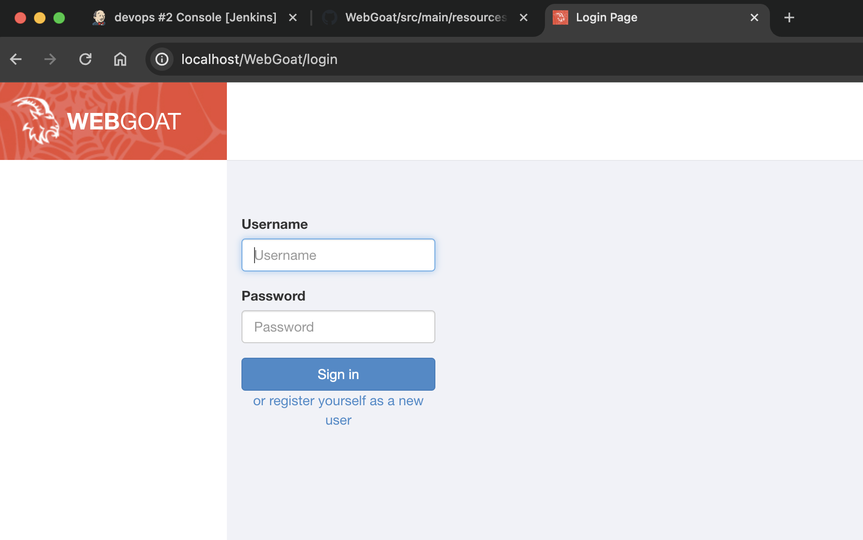 우선 배포와 실행이 정상적으로 되었는지 확인해보기 위해 http://127.0.0.1/WebGoat로 접속해본다.