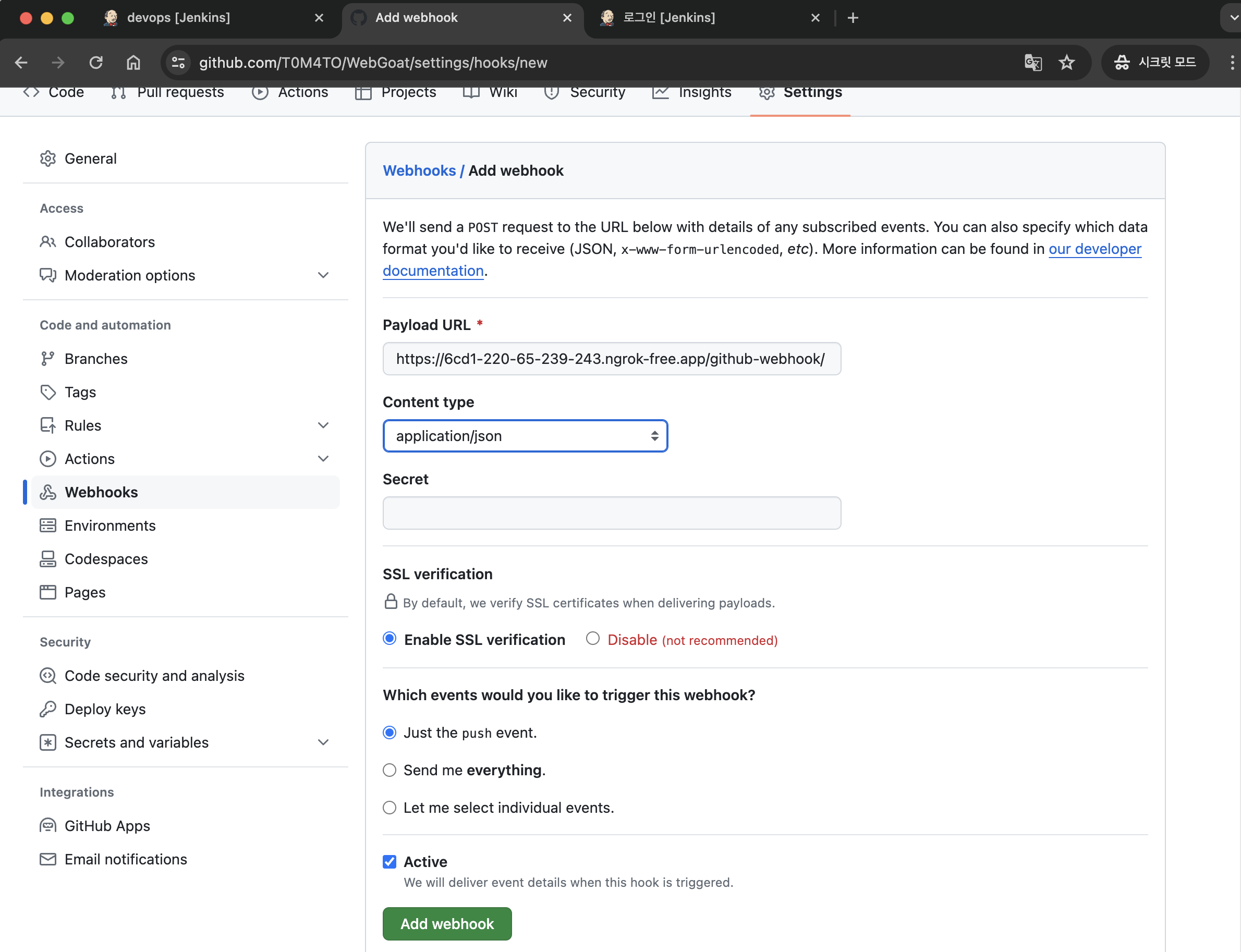 다시 Webhook 설정화면으로 돌아와, Payload URL에 'https://[ngrok 도메인]/github-webhook/' 을 입력한다.