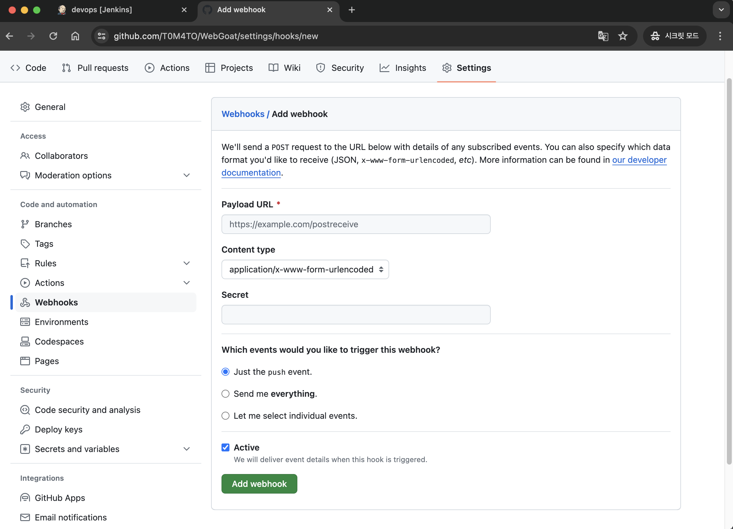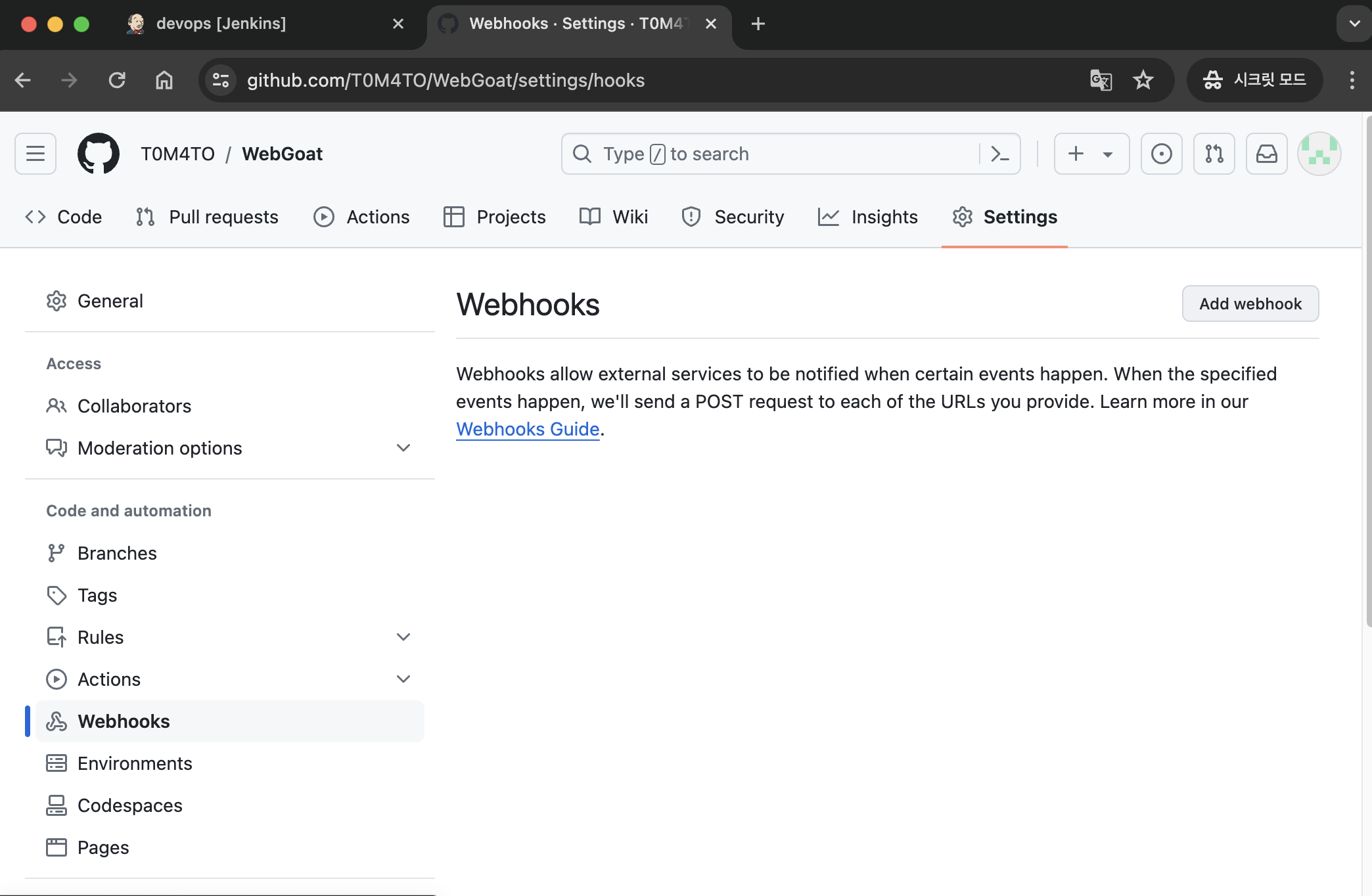 그리고 왼쪽 메뉴 중 Webhooks메뉴를 선택한 뒤, 우측 상단 Add webhook을 클릭한다.