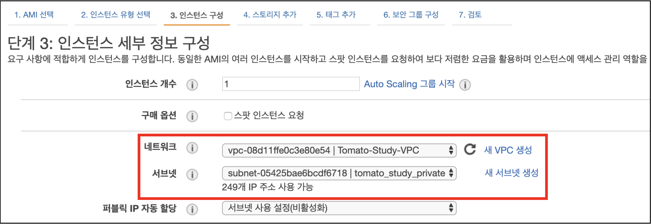 AMI, 인스턴스 유형, 스토리지, 태그, 보안 그룹은 이번 네트워크 구성과는 무관하므로, 실습 시 상황,환경에 따라 알아서 선택하여 진행하며, 네모박스가 쳐진 설정을 제외한 다른 설정도 역시나 알아서 선택하여 진행