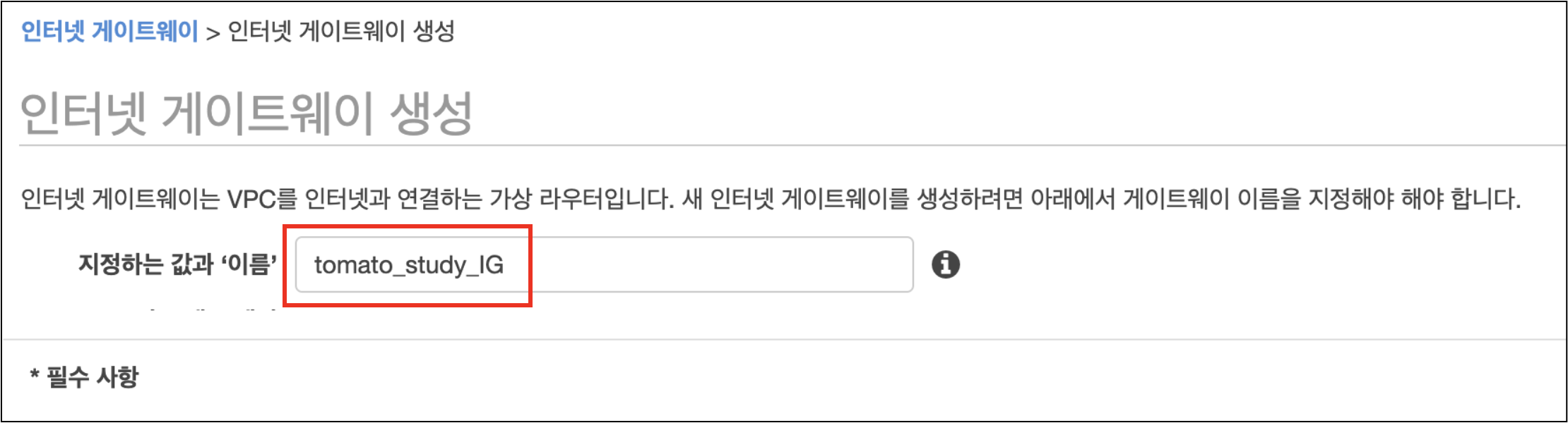 다섯번째로, VPC의 인터넷 사용을 위해 Internet Gateway를 생성