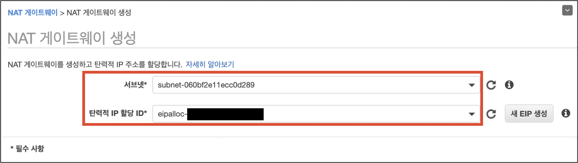 세번째로, NAT Gateway에 사용될 탄력적 IP를 Amazon 풀을 사용하여 할당
