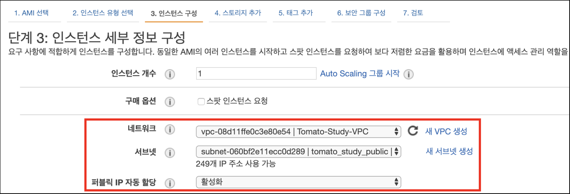 역시나 여덟번째 과정과 동일하게, 네트워크와 서브넷 설정을 제외한 다른 설정은 알아서 선택하여 진행하나, 다른점이 있다면 외부에서의 접근이 가능해야하므로 퍼블릭 IP를 할당해 주어야 함.