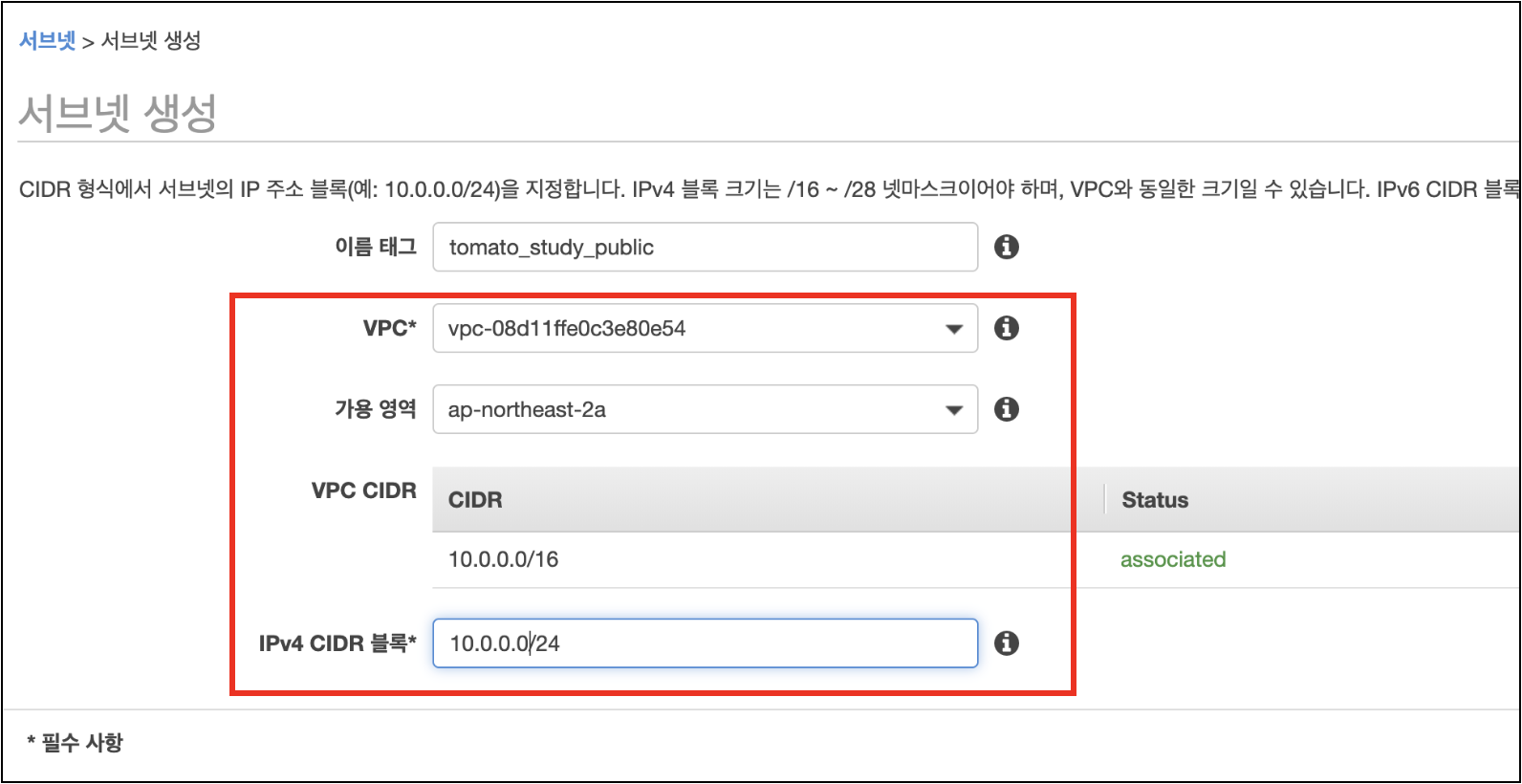 두번째로, VPC안에 만들고자 하는 Public Subnet을 10.0.0.0/24 (c class) 대역을 사용할 수 있도록 설정