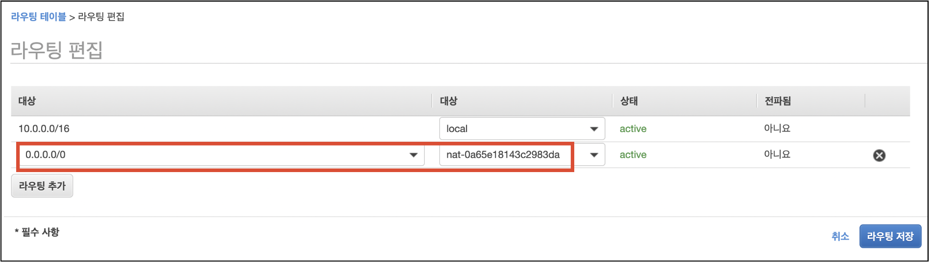 여섯번째로, Private 서브넷에 해당하는 라우팅테이블을 찾아, 0.0.0.0/0 즉 로컬 패킷 제외 모든 패킷이 NAT 게이트웨이로 가도록 설정 (NAT Gateway를 통해 통신을 시도하기에, Outbound를 통한 인터넷 통신은 가능하나, 외부에서 Inbound를 시도할 수는 없는 Private subnet이 된다.)