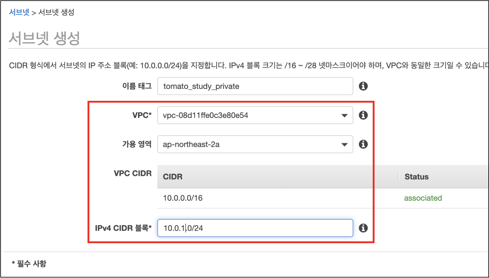 마찬가지로 VPC안에 만들고자 하는 Private Subnet을 10.0.1.0/24 (c class) 대역을 사용할 수 있도록 설정