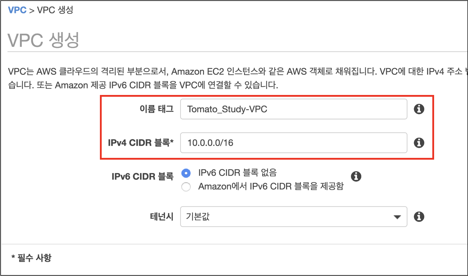 우선 첫번째로 VPC를 생성한다. B class 단위로 IPv4 CIDR 블록을 설정